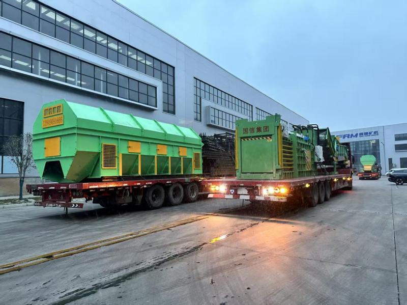 在发货现场,数辆重型平板挂车整齐排列,体型庞大的垃圾分选主机、输送系统及配套设备被专业吊装团队精准安置在运输车上。设备主体以标志性的绿色为主色调,搭配黄色防护标识,外观工艺精良,结构设计紧凑,充分展现了国信集团在设备研发与制造上的硬实力。工作人员严格按照物流规范,对设备进行加固、防护处理,确保长途运输过程中的安全与稳定。